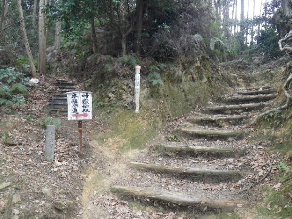 登山口は階段から始まりますが、上を見上げると、サクラの木がアーチ状に並んでいるので、
