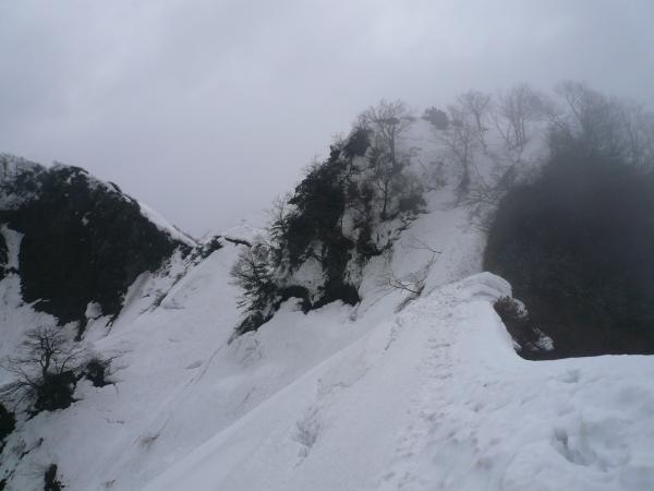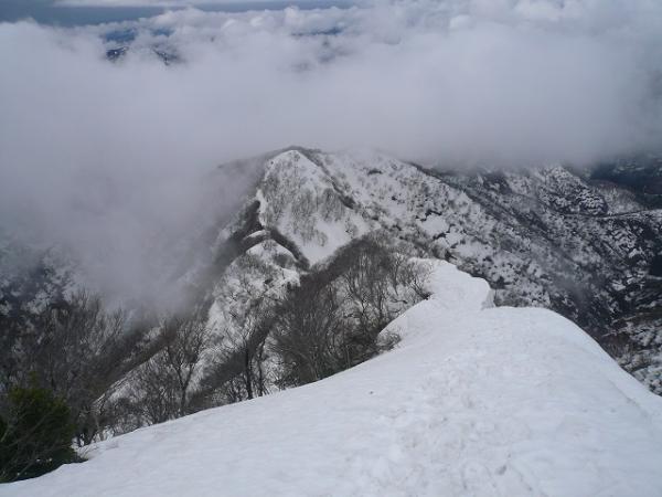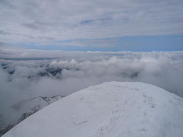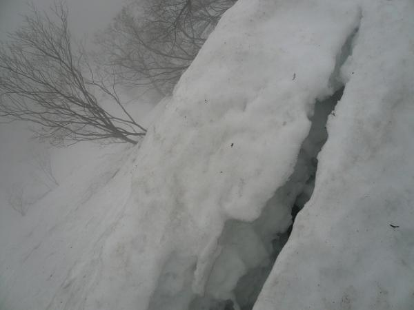 3月の終わり、粟ヶ岳を加茂市側の中央登山道から登ってきました。終始稜線歩きなので、天気が良ければ最高の景色を見ながら歩くことが出来ますが、この日は前日からあいにくの雨。真っ白なガスが漂っていました。足元は締まった雪の登山道を登りはワカン、下りは12本爪アイゼンで歩きました。第1・第2ベンチはまだ雪の下。雪庇は有りませんでしたが、やせ尾根歩きが多く所々クラックがあります。粟庭の頭手前のナイフリッジ状の尾根が右にも左にもクラックが出来ていて、用心してここで引き返しました。なんとここで青空が出始めるのですが・・・。途中何度も雪崩の轟音が轟いていました。雪山の装備でベテランの人と登ることをお勧めします。車道は第1水源地が朝の最終除雪地点でしたが、なんと下山したら県民休養地まで除雪されていました。