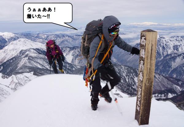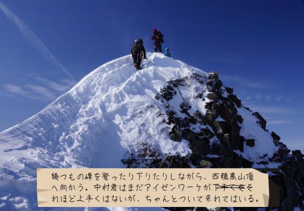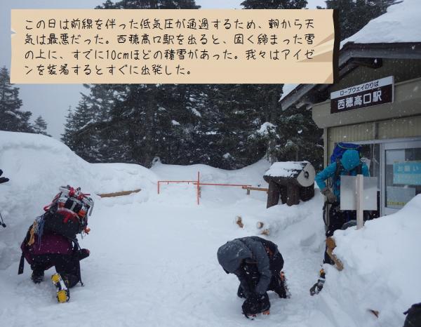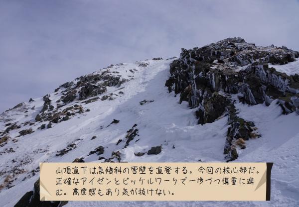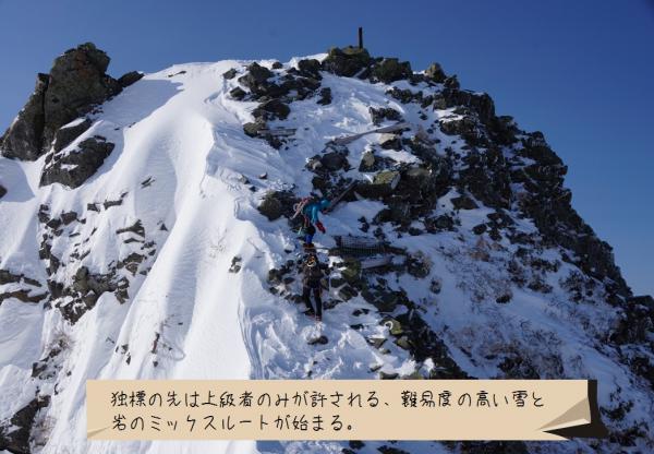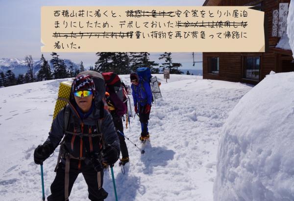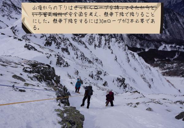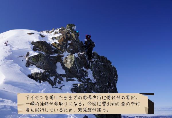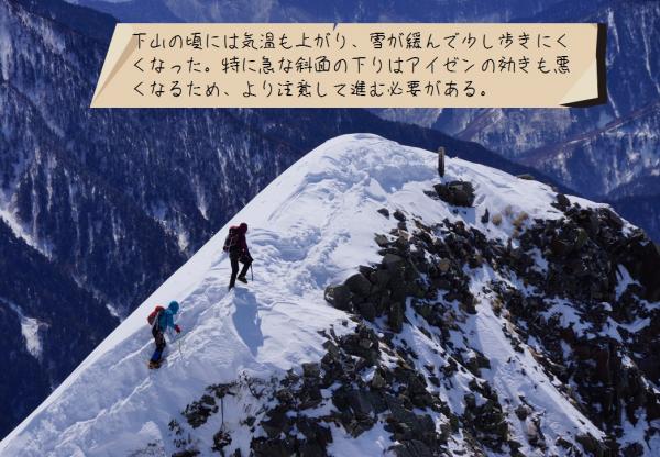 二日目の昼頃から気温の上昇とともに雪が緩んでしまい、特に急な斜面でのピッケルやアイゼンの効きが悪くなりだしたので注意が必要です。
