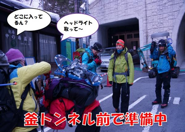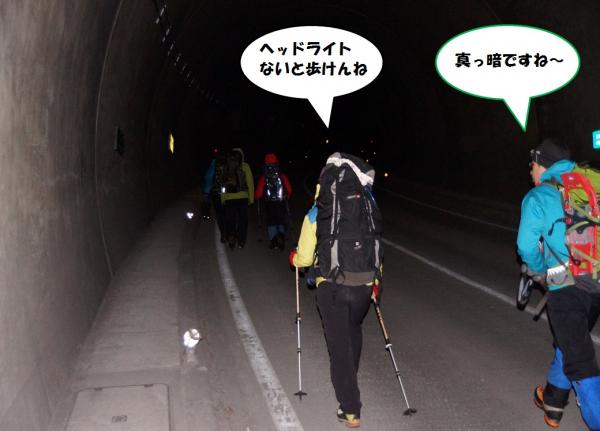 釜トンネル内部は真っ暗なのでヘッドランプは必須。工事車両も通るので注意しましょう。