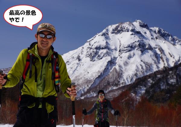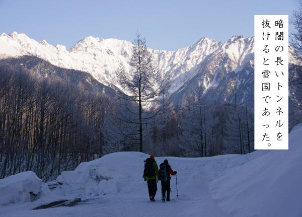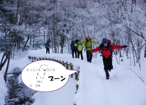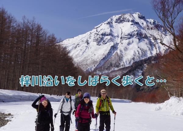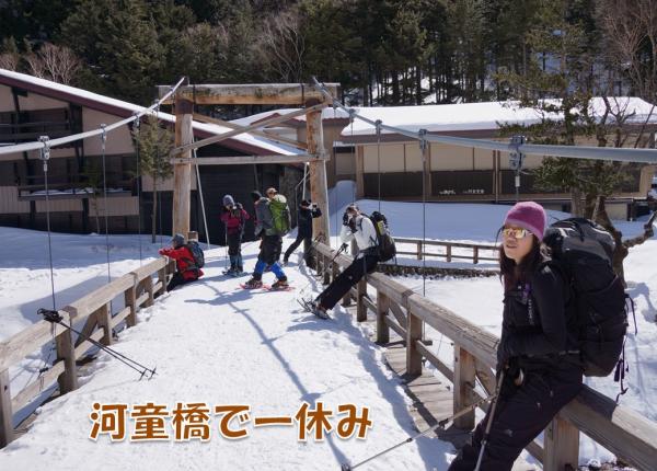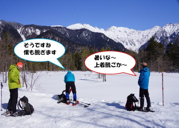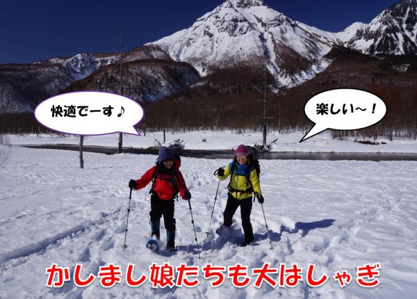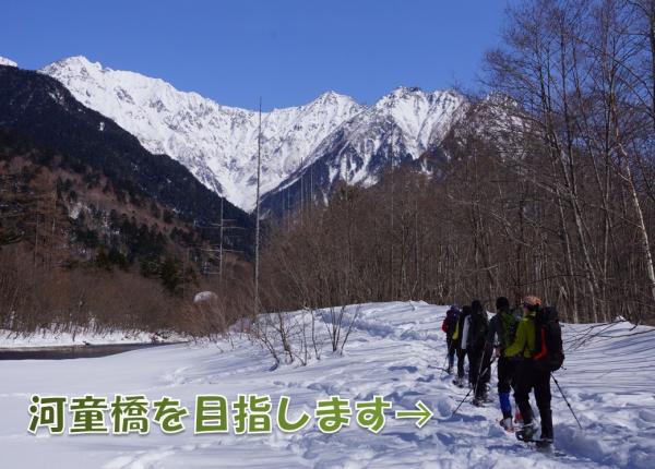 河童橋まではスノーシューを履いて移動します。天気が良かったせいか、他にも数パーティーが歩いていました。