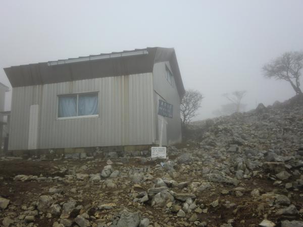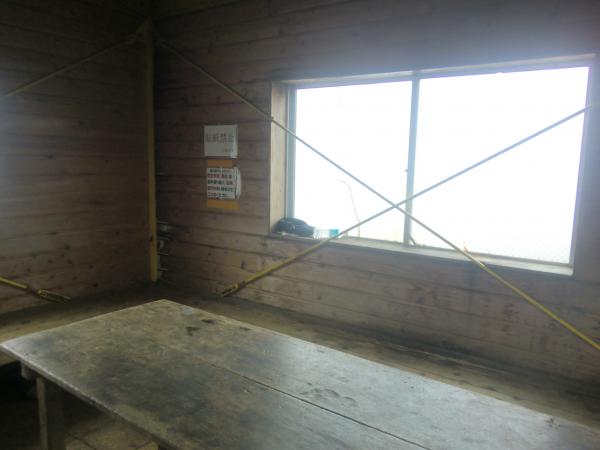 スタート地点の気温は12度。山頂の気温は9度。あまり差はありませんが、山頂付近はガスがかかっていたり風も強かったため、アウターシェルの中にダウンジャケットを着ました。藤原山荘は風が完全封鎖されていますが人数はあまり入りません。