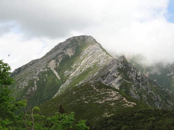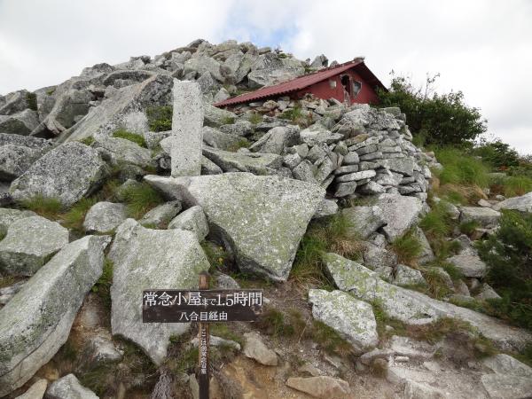 蝶ヶ岳に到着しても天候はどんよりとした曇りは回復せず、諦めて下山。