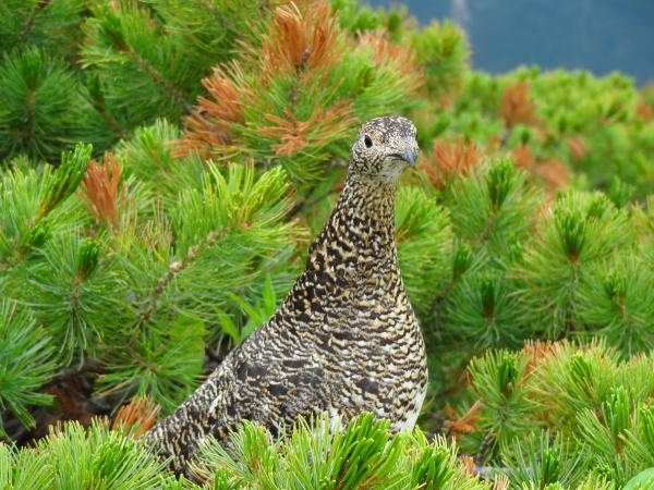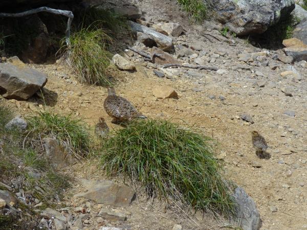 山頂直下で雷鳥の親子にあいました。カエルのような鳴き声ではなく、