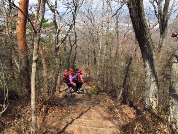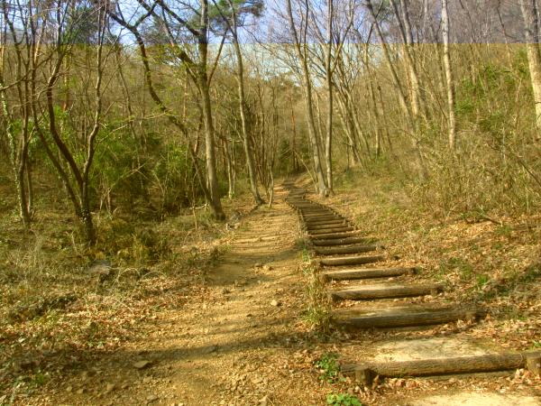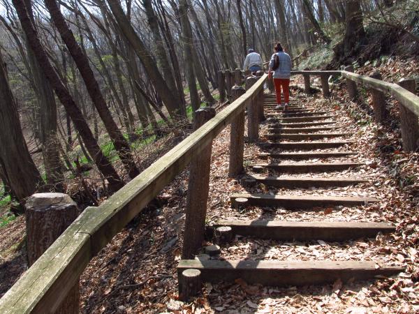 カタクリの園を後に階段を登ると中岳。木々の合間から佐野の街や東北自動車道が望めます。一休みしたら三毳の関跡、青竜ヶ岳を通って、稜線上の道をかたくりの里へ向かいます。途中は稜線上の気持ち良い道や長い階段があります。