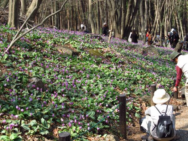 駐車場からスタート。カワヅザクラや水仙、コブシが咲く舗装路をから階段を登ってカタクリの園へ。咲いてました。カタクリが一面に。平日でしたが、たくさんのカメラマンが撮影に来ています。しばらく春色のカタクリを楽しみましょう。