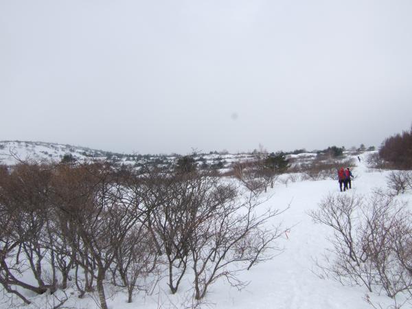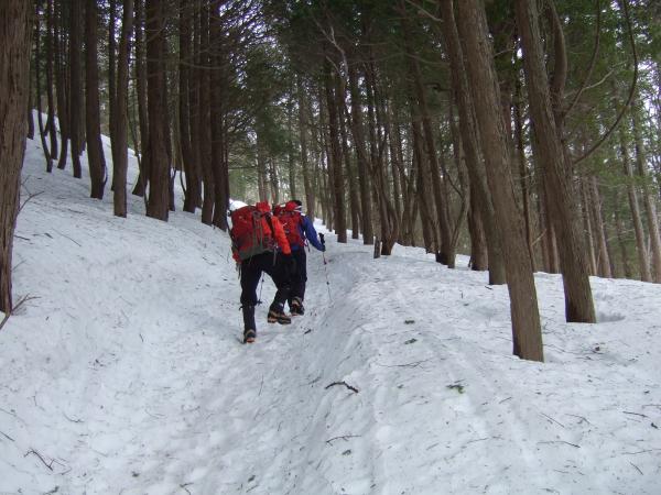 朝、あだたら高原スキー場を出発し、樹林帯を地道に歩き高度を上げていきます。勢至平付近まで来ましたが、遠くの山を眺めることはできませんでした。雪は少し湿気のある春の雪を感じました。