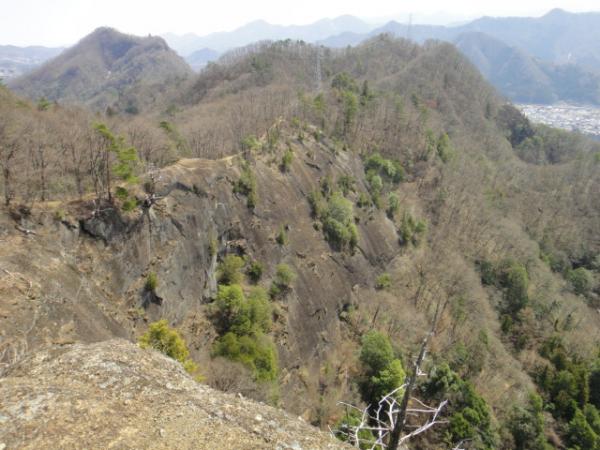 気を取り直して、稚児落しへ。途中で登山道を整備している市の職員の方にバッタリ遭遇した。親切にもルート状況を教えてくれたのだが、それによると兜岩のトラバース時に使う鉄の支えが、最初の箇所だけ山肌から抜け落ちてしまっているらしい。花咲山まで行きたいと伝えると、今度は花咲山の状況まで教えてくれた。滑り易いから注意とのこと。「岩殿と花咲が縄張りだから何でも言ってね。あと何か問題があると思ったら教えてね」