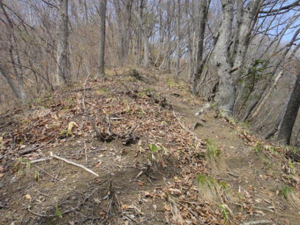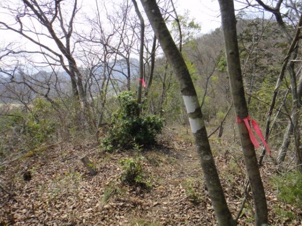 尾根に飛び出してからはずっと尾根歩き。斜度が結構あり、しかも粘土質なのか、やたらと足下がズルズルする。危惧していたルートだが、尾根に出てからはかなりの数の赤布が出てきたので杞憂に終わった。そんなに人は入っていなさそうだが、それでも心象が違う。しかし心臓が辛いなぁ・・。