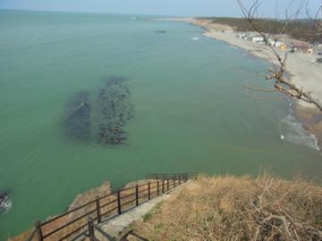 頂上は、平らで、休憩をするのに最適ですが、今回は、もう少し足を伸ばして、海の見える展望の良い場所,観音堂で休憩しました。 そして、穏やかな春の日本海の眺めを堪能し、帰路の灯台コースへ。