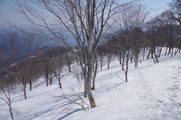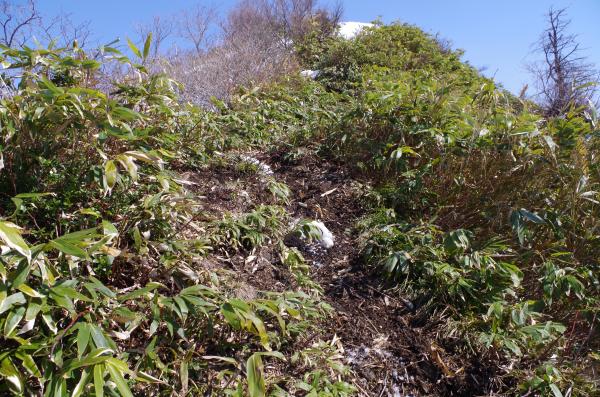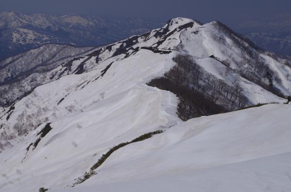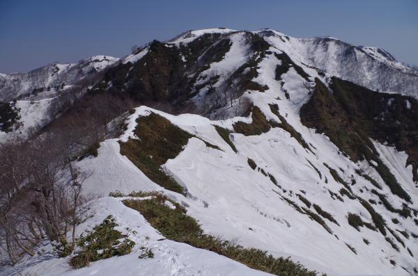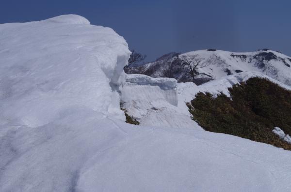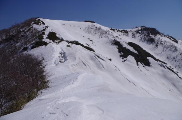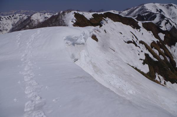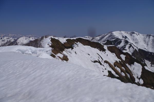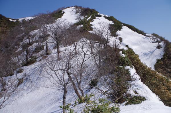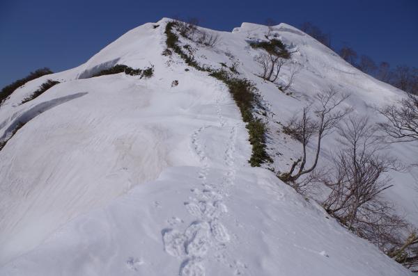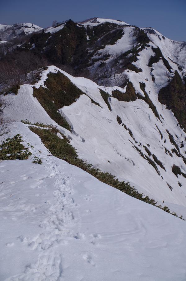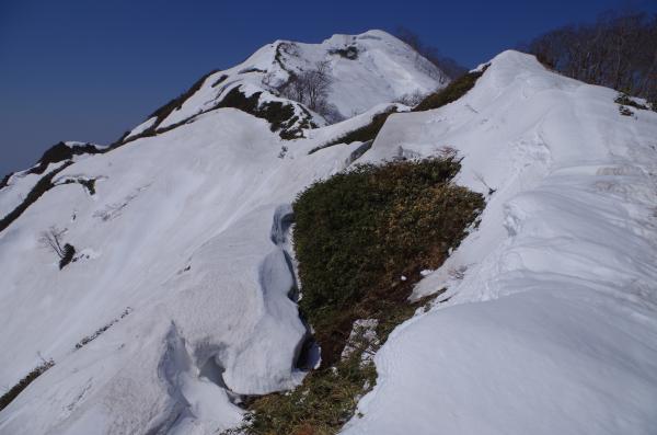 大日ヶ岳と鎌ヶ峰の中間点では尾根上に残雪は無くて土が出ています、アイゼンやスノーシューはこまめに着脱しましょう、雪庇や雪の割れ目に注意してください。