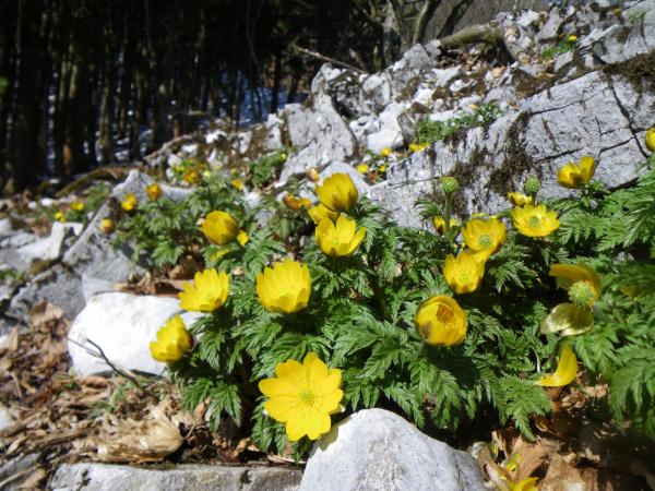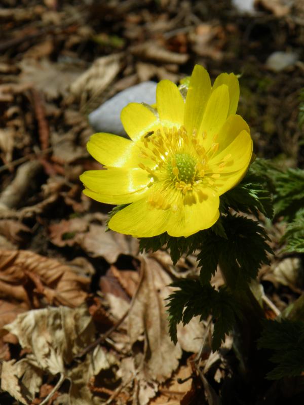 今回、8合目付近はややピークが過ぎた感じが多く、9合目付近はつぼみ~満開といった感じでした。福寿草の他に、大貝戸コース下部にミヤマカタバミ・アセビ、ニシキコロモ、ネコノメソウ、8合目付近にセリバオウレン・節分草が見られました。聖宝寺コース下部でもミヤマカタバミが見られました。