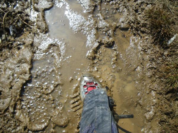 ③8合目~藤原山荘間は泥道が続きます。藤原山荘~藤原岳も泥道が少しあります。この時期はスパッツが必携ですが、装着しても泥が付きます。