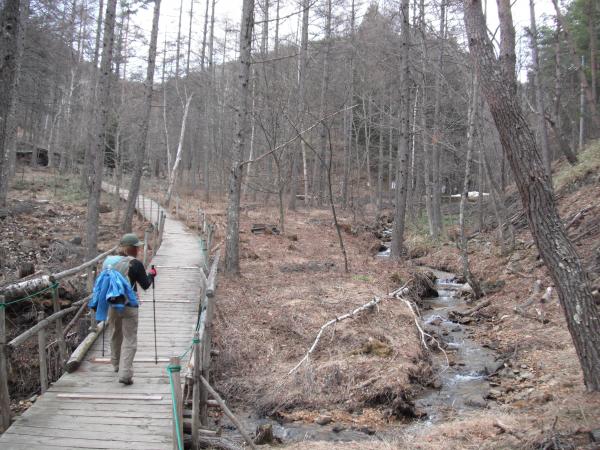 登山口を奥に進むと、遊歩道がでてきます。綺麗な沢の上を渡ります。
