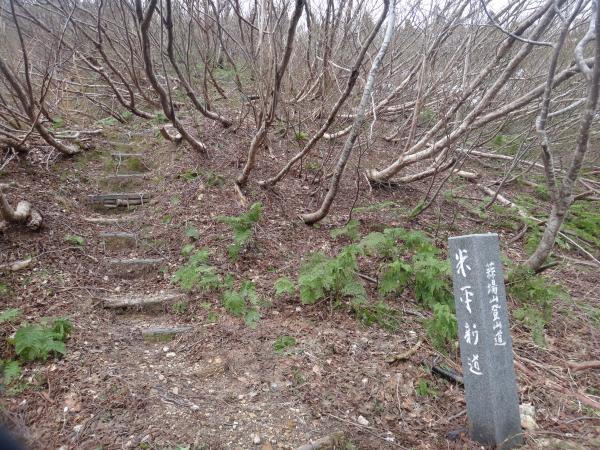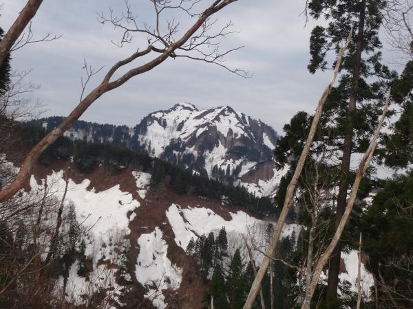 車を降りて車道歩きすること一時間、昔の坑道跡やお猿さんと戯れながら加治川ダムまでやってきました。登山口にはまだ新しい立派な黒い石造りの道標が。そして最初から急登を行くこととなります。腐れ雪に足を取られ、藪漕きを強いられ独標まで辿り着くと、目指す山頂の全容が遥か遠くで待ち構えていました。