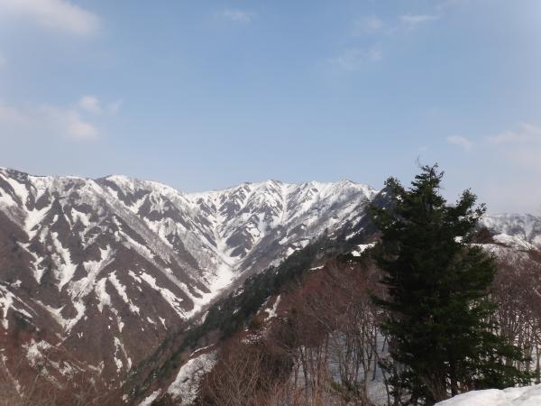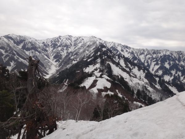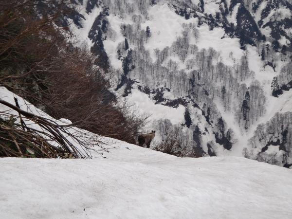花の種類は少なかったものの、イワカガミの大群生が目を楽しませてくれたり、後方のラクダの瘤のような爼倉山が次第に低くなっていく様を楽しみながら相変わらずの急登を登ります。中間地点の岩岳に到着して地図を確認、あと半分!と思って進行方向に目を遣ると、道がいきなり急下降、そしてまた登り返しており、思わず嘆いてしまいました。気合いを入れ直し鞍部まで来ると痩せ尾根が登場、雪がナイフリッジに乗っかっており、その上を恐る恐る進むはめに。落ちたら困るので軽アイゼンにピッケルまで装備しました。戸隠の蟻の塔渡りを彷彿とさせますが、雪が付いているのでこちらの方が厄介に感じました。