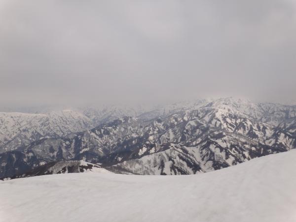 烏帽子岩と兎戻しで鎖が出てきてアイゼンを装着したまま登りましたが、鎖よりもスノーリッジの綱渡りの方が緊張しました。その後は雪庇とクラックを避けつつひたすら登ります。いつの間にか眼下に加治川ダムが広がりダイナミックな高度感を味わえます。ギザギザの山容の通りに小ピークをいくつか越えて遂に登頂。6時間もかかってしまいました。念願の飯豊は残念ながら上部にガスがかかりイマイチでしたが、圧倒的な存在感を感じました。