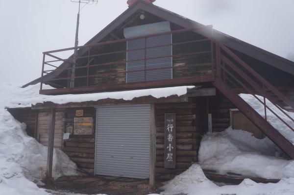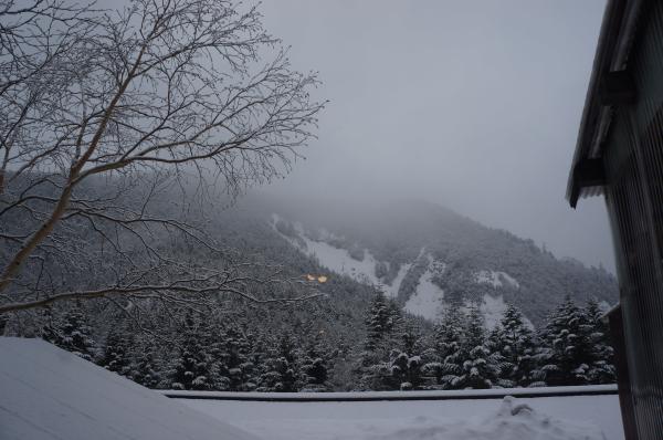 2日目の朝。天候が昼から悪いとの予想ははずれ、まさかの朝から雪。しかも水分多めのどっしりした雪でした。朝ごはんのあと雪がやみ、ゆっくり行者小屋まですすむことに。