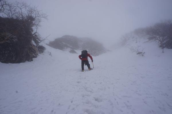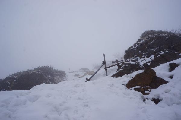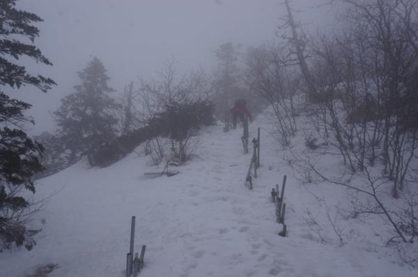 上空は風もなかったので、『行けるところまで』と地蔵尾根を登り始めました。朝の雪で下がぐずぐずしていて歩きにかったです。階段や鎖は少しだけ出ていたので、慎重に・・・尾根に出た所で視界の悪さ・風の強まりを感じたので下山することに。