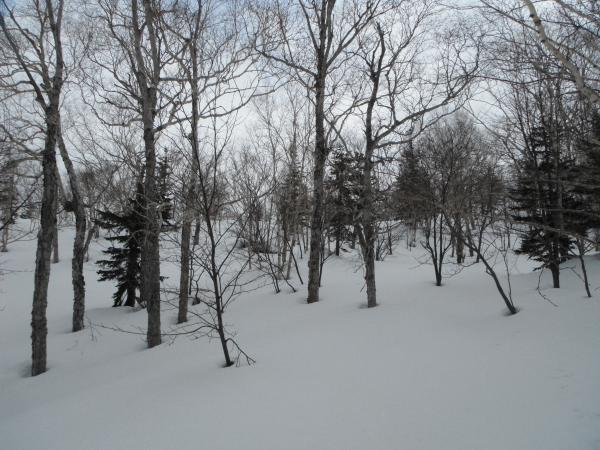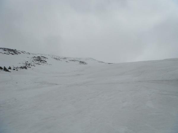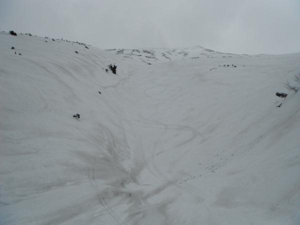 白銀荘前のスキー場跡を北にトラバースして行き、富良野川のスノーブリッジを越え、前十勝へ続く尾根に取り付きます。そこからはずっとシールで直登。柔らかすぎないザラメ雪で非常に登りやすかったです。登っていて左手に顕著な無木立の楽しそうな沢地形が。ここを滑ることに決めました。