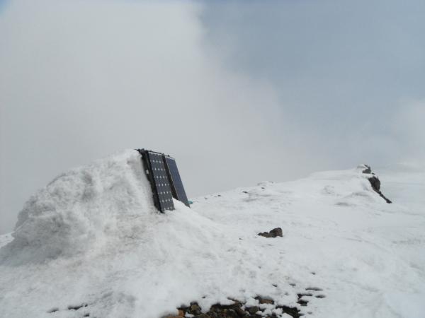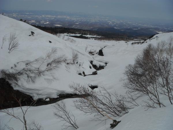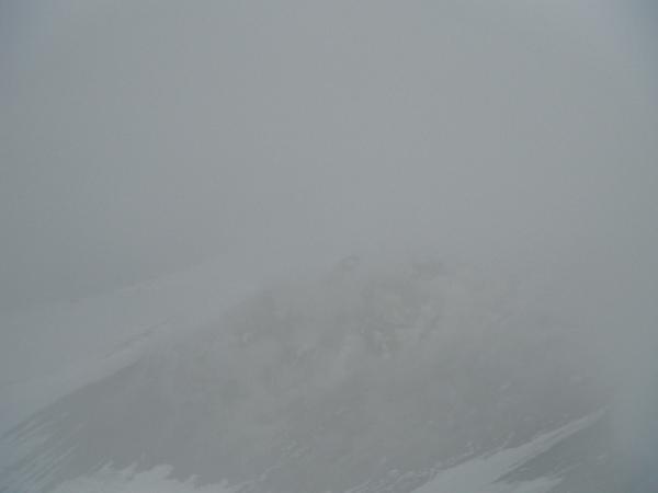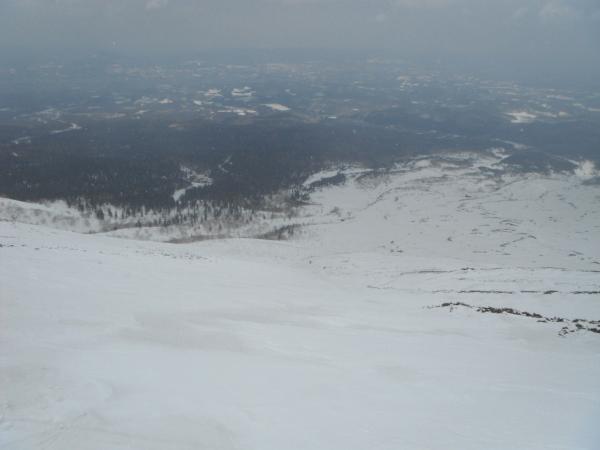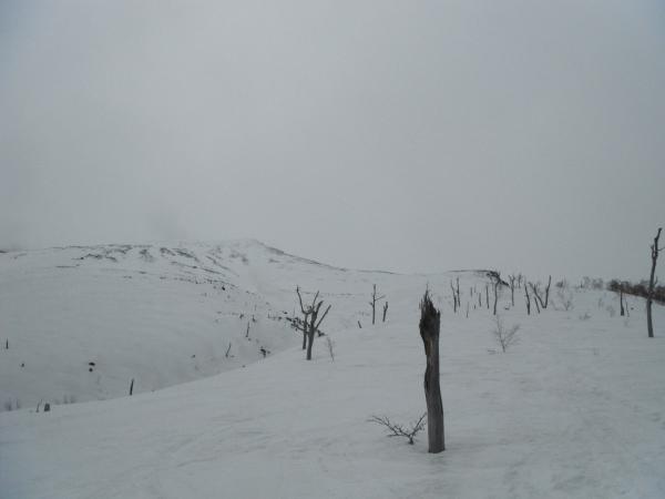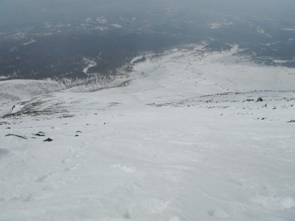 前十勝直下は岩が出てきたので、スキーをデポし、つぼ足で前十勝を往復しました。火口からのガスがノドを刺激します。