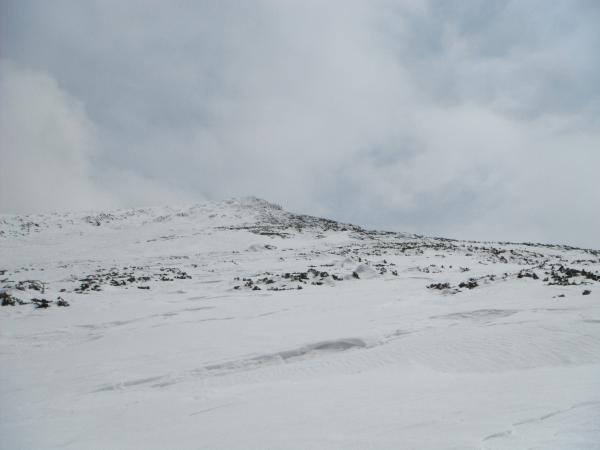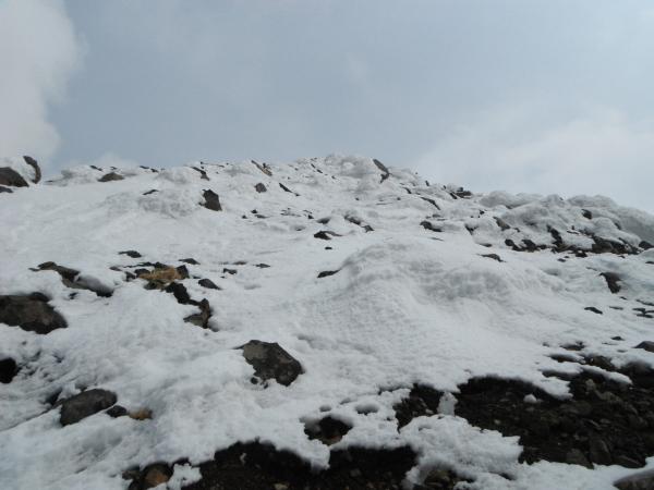 前十勝直下までシール登高、その後は岩が露出しだしたのでつぼ足登高。