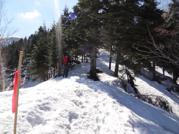 ロープウェイ西穂高口から樹林帯の登りが始まります。ここでアイゼンを付けた