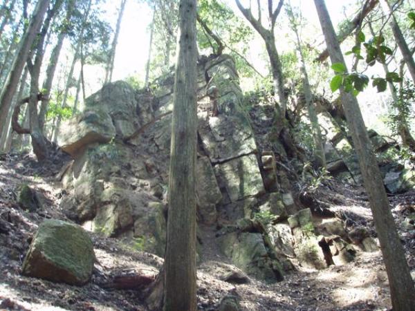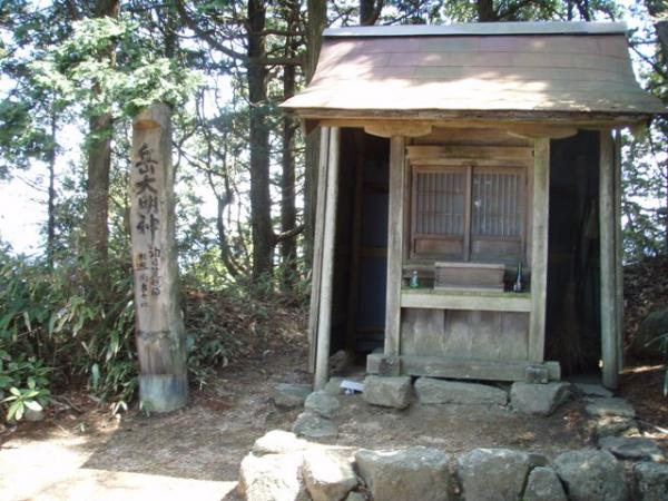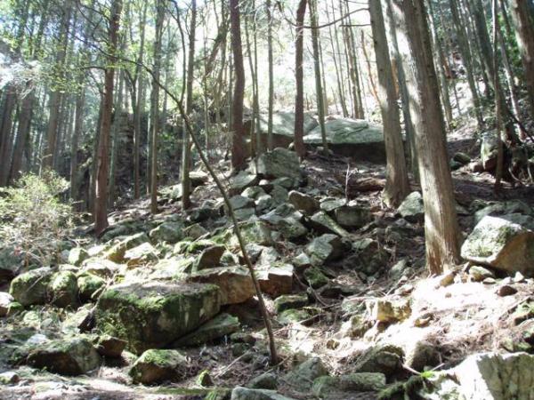 巨岩の転がる沢に沿って進んで行くと程よい山道になりますが、全体的に歩きにくいです。危険そうな所には何箇所かフィックスロープが張られています。稜線まではスイスイ登って行くことが出来、分岐を右手に進むと岳大明神の祠と休憩小屋のある油日岳山頂。ここからは、甲賀の里が一望できます。