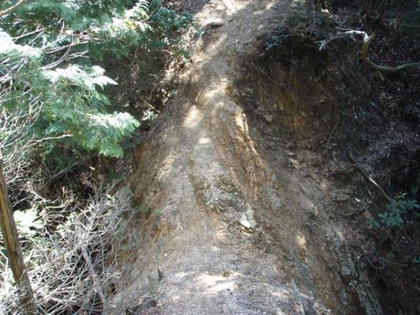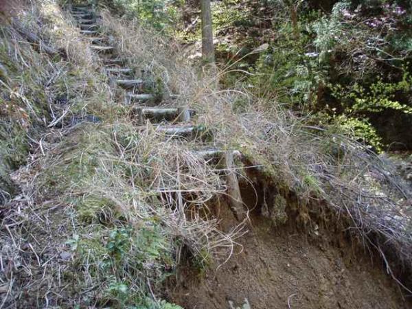 昨年の台風の影響で登山口周辺は荒れていますが、崩れ落ちた登山道の横に側道が作られていました。下り時に何も知らずに登山道をまっすぐ降りてくると階段が途中でなくなります…。