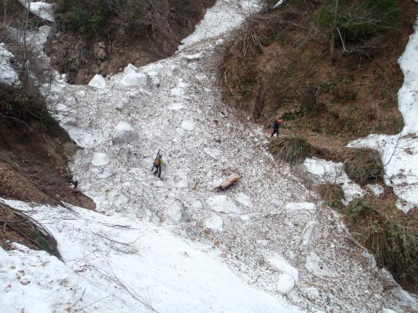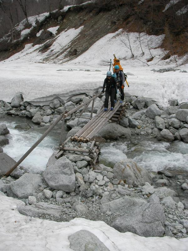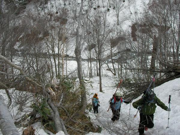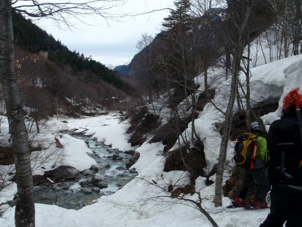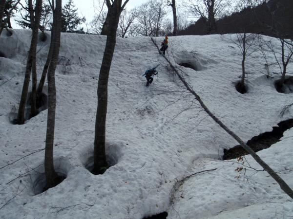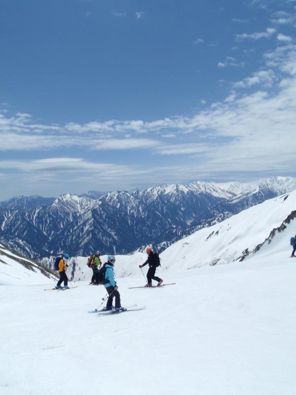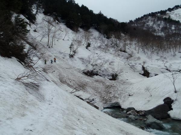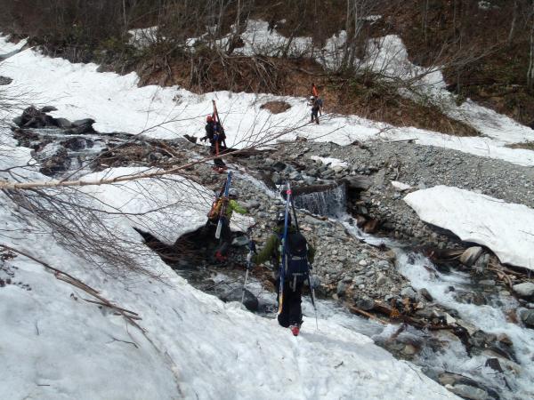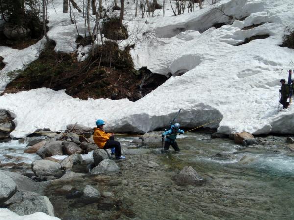 - 天候もよく全体的に快適なザラメでした。一の越付近のみアイスバーンになっていたので登りでアイゼンやスキーアイゼンを装着しました。御山谷の沢は雪解け水で水量も多く、ロープを使用した徒渉を必要とするところがありました。その後の水平歩道も崩れているところがあったり、急斜面のトラバースがあったりと緊張を強いられる箇所も数カ所ありました。