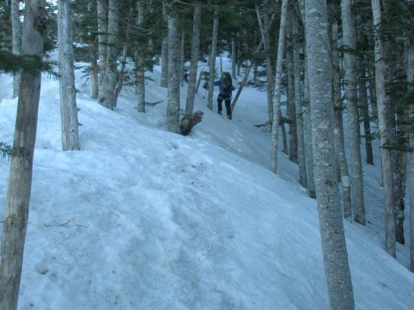 天候や時間帯により雪がゆるみ踏み抜き多発で歩きにくいです。