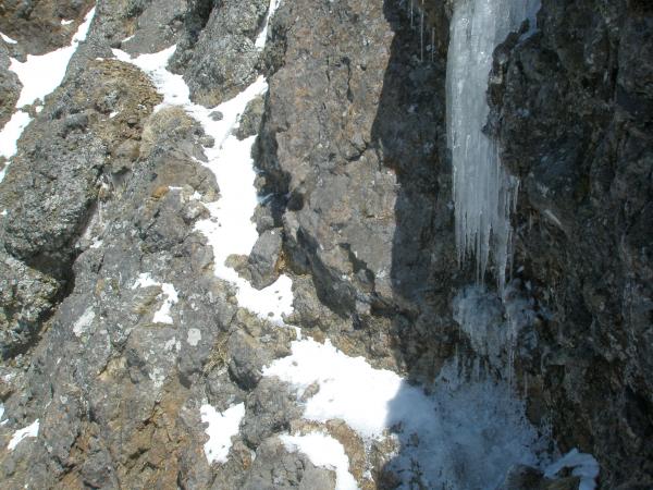 核心部のP3ルンゼが氷結していて、不慣れなメンバーがいる時はロープ使用が安全です。