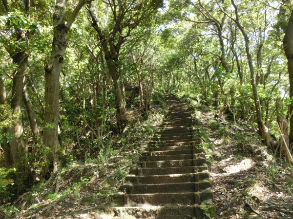 アップダウンの繰り返しに細い道、絶壁の中に作られたなかなかな傾斜の強い階段を登ると、山頂。