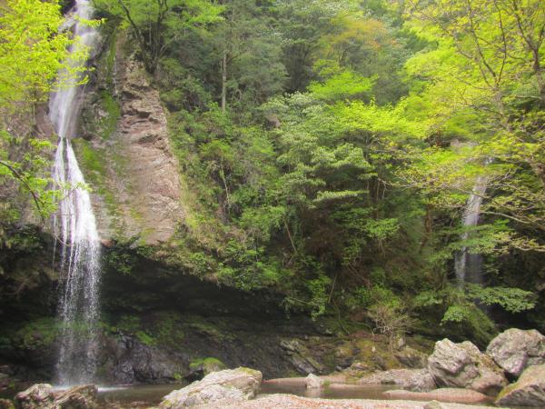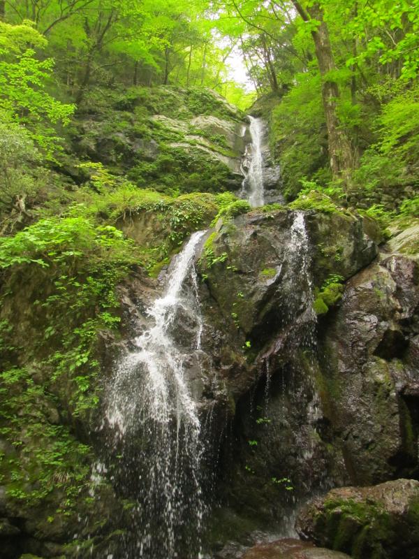 スギ沢にかかる華麗な「雌滝2段50m」と、本谷に懸かる勇壮な「雄滝60m」。