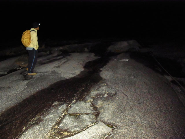 夜間の登山は、辺りの地形はまったく分からないが、森林限界を超えると岩場に変わり、山頂まで延々と延びるロープを目印に、ひたすらその白いロープから外れないように登り続けるだけである。
