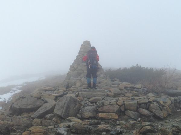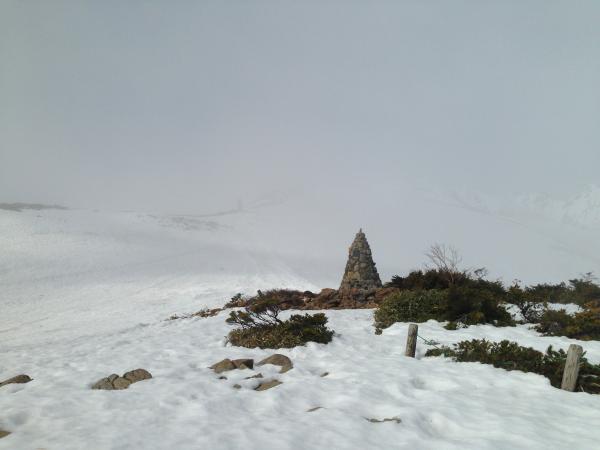 八方尾根の前半はとくにだだっ広い尾根なので視界が取れないとルートが分かりにくいです。晴れるのを待つつもりでゆっくりとゆっくりと登っていきます。八方山ケルン・第2ケルン・第3ケルン・丸山ケルンとたどっていきます。また、八方池までは夏道がかなり出ていました。ハイマツ帯では踏み抜きも何回かあり、腰まで潜ることも。脱出に手間取ります。