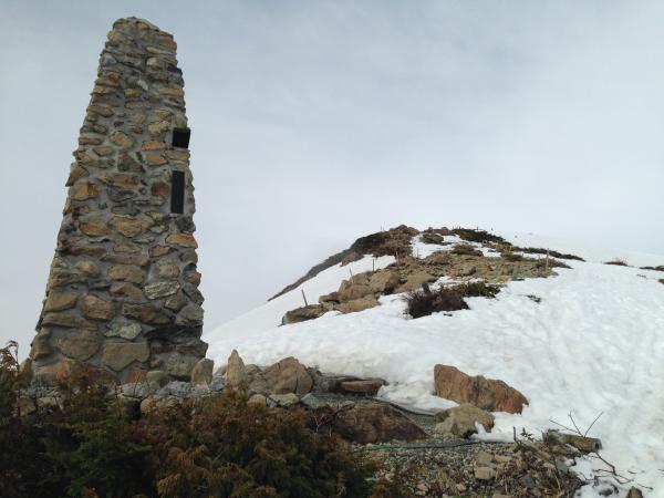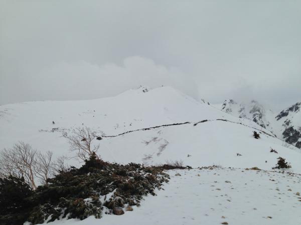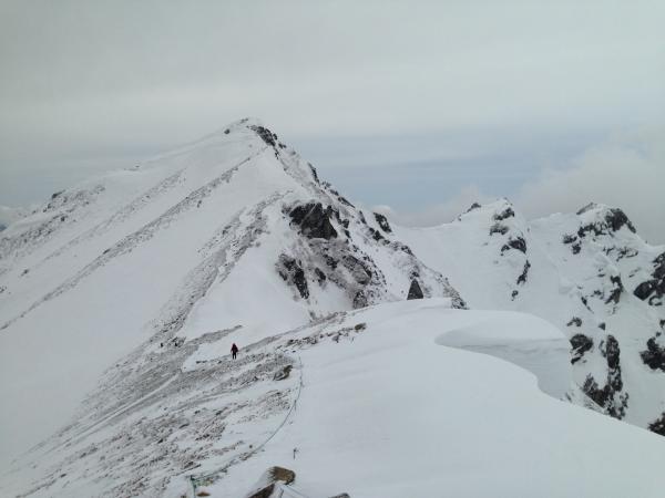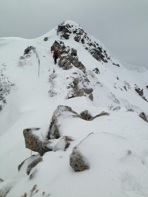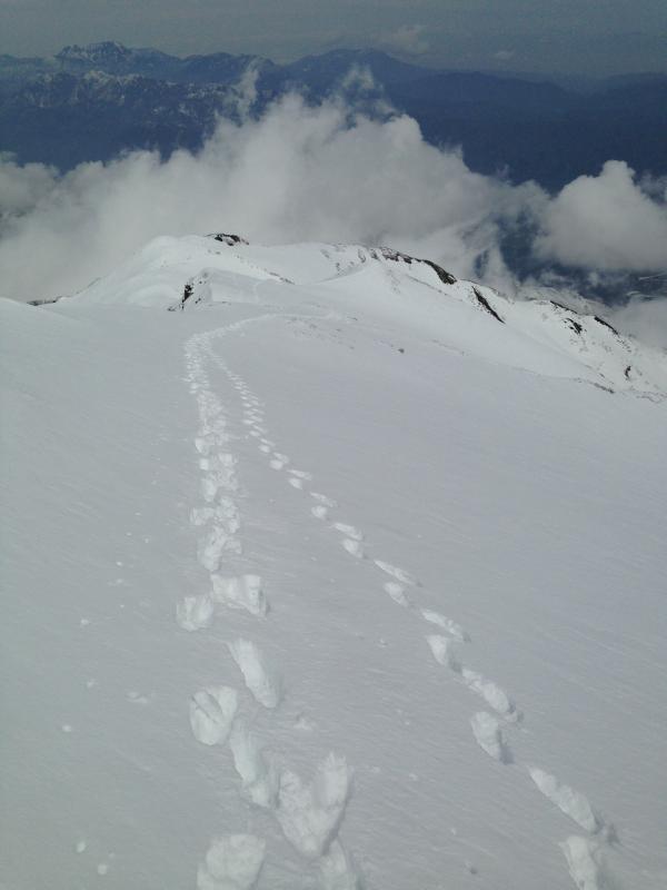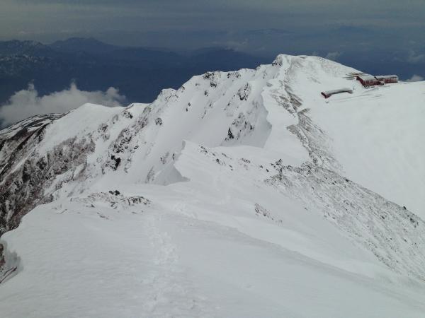 丸山から先は尾根通しに歩きましたが、細い部分もあり、少し注意を要します。頂上小屋から先の最後の登りは右手に雪庇が発達しています。丸山から上では昨夜の雨は雪だったようで、主稜線ではきれいなエビのしっぽが発達していました。