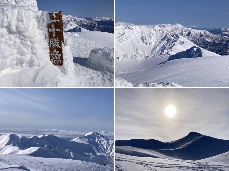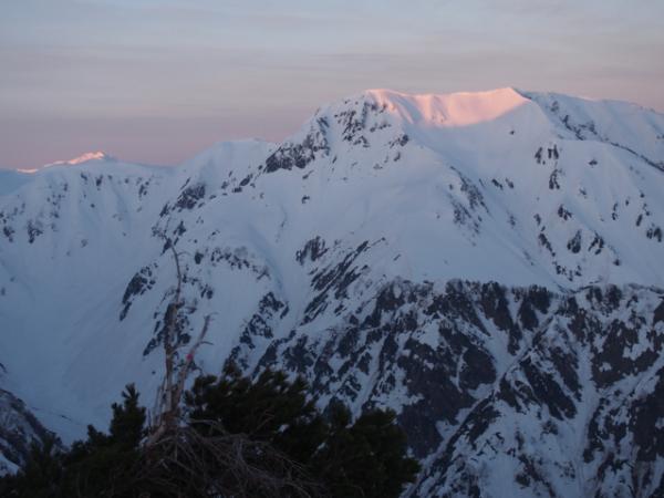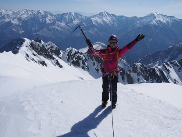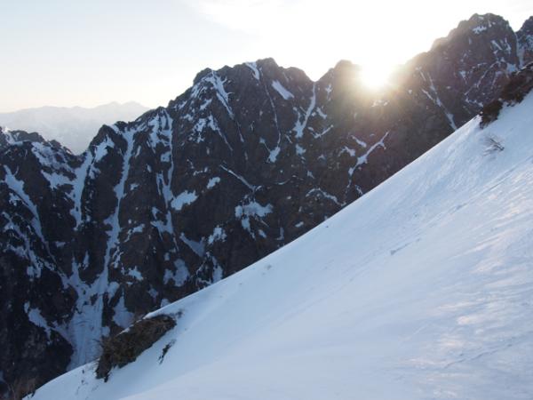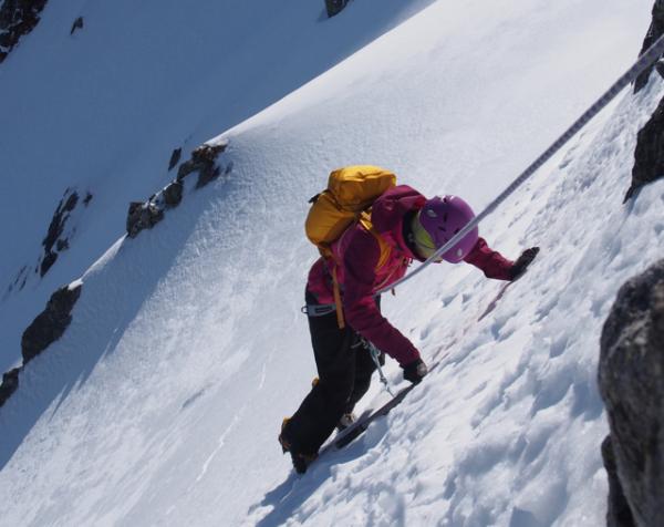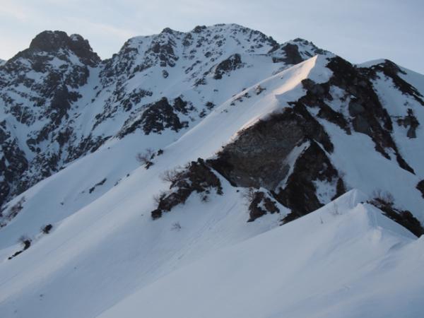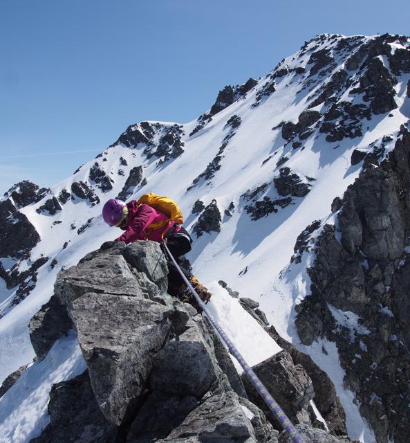 翌日は4時過ぎにテントを出発。最初こそただの急登でしたが、徐々に切り立った尾根に変わり、難所が連続します。スピッツェとピックを上手に使って、着実な三点支持を心掛けましょう。頂上直下のいくつかの難所は、真下から見上げると直角に見えるほどの急斜面。雪もカチカチに凍っており、アイゼンの前爪しか刺さりませんでした。また、落ちたらアウトのトラバース箇所も多々あり、終始気が抜けません。行かれる際には、確実なロープワークを心得ている経験者と行くようにしましょう。