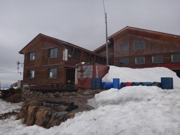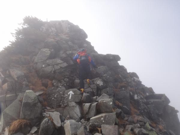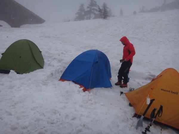 初日は小雨の中、頑張って先輩たちに付いて行きました。急登と空気が若干薄い為既に息が切れ気味。山荘に着いた時には雨がざあざあ降り出しましたが、折角運んだテン泊道具を台無しにしまいと意地になって設営します。先輩が着々と組み立てていく中、案の定私は風に煽られ飛ばされかけながら、しかも自在が夏仕様になって居た為、かじかんだ手で張り綱をほどく所から始めなければなりませんでした。時間が経てば経つほど命取りになってしまいます。見かねた先輩方が手伝ってくれたおかげで何とか完成しましたが、ソロだったら確実に小屋泊りに切り替えていたことでしょう。テントはまだまだ落第点です(´Д`)