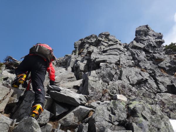 丸山までは冬道、それ以降は殆ど夏道なので、岩場はアイゼンを外した方が安全だと思います。