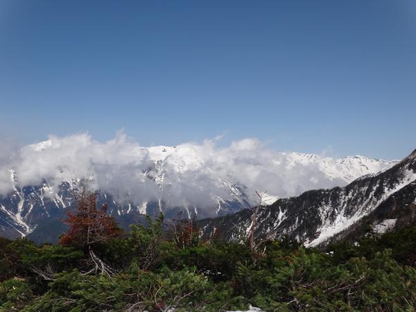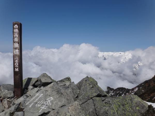 翌日も雨が止みません。弱くなるまで小屋で停滞し、霧雨に変わったところで漸く出発。丸山を過ぎ、夏道の岩稜帯に差し掛かったところでガスが切れ、待望の青空が出現、皆思わず歓声を上げていました。雲間から顔を覗かせたのは、笠ヶ岳の三角頭、振り返れば焼岳の荒々しい山肌が見え隠れしています。そして前方には西穂のピラミッドピークが堂々と待ち構えていました。圧巻の一言、あの頂を越えて行きたいと思いが募りましたが残念ながら時間切れ、独標が終点となってしまいました。