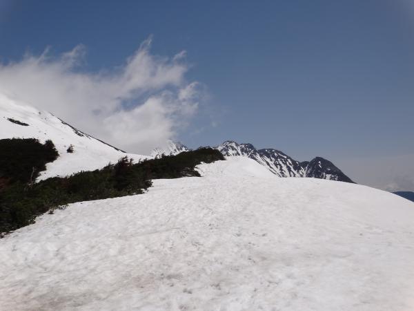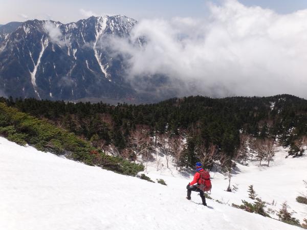 皆中々下山しようとしません。もちろん私もです。西穂の重力に私達はすっかり引き寄せられていました。時間も押していたので名残惜しい気持ちを抑えて、気を引き締めて岩場を下山。岩場が終わると雪の道を駆け下りました。絶景の中を皆大はしゃぎで走り抜けます。私は調子に乗りすぎて足を取られ転倒しかけました。空はいよいよ晴れて背中には前穂のギザギザ尾根がせり上がってきました。奥穂も辛うじて見えましたが、ジャンダルムは未だガスの中、簡単には姿を現しません。