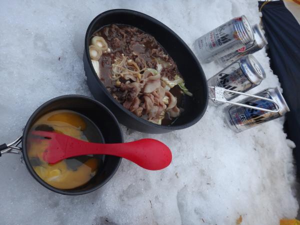 身も心も冷え切った体に先輩特製すき焼きと店長のホット梅酒をごちそうになりました。何から何まで世話になりっぱなしです。仲間と登山って本当に楽しい!私に出来ることはしっかり休養して明日に備えること、あったかい寝床を作って早々と床に就きました。外はかなり強い雨と風でテントが破壊されるのではと思うくらいでしたが何とか朝までもってくれました。こんな厳しい状況でもテントの中は不思議と暖かく、性能の良さに偉く感動してしまいました。私は朝までぐーすか眠ってしまいましたが、先輩方はあまり寝付けなかったそうです。何だか申し訳ないです。