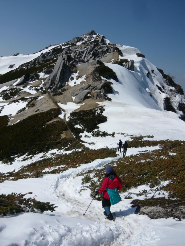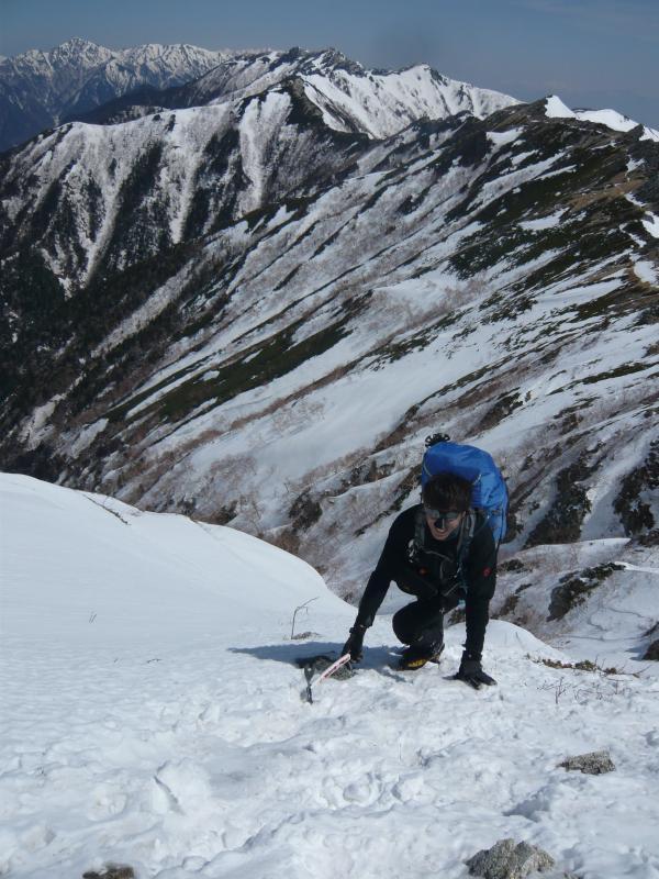 小屋の方から「危ないので直登して下さい」と言われていましたので、ピッケルに持ち替えました。