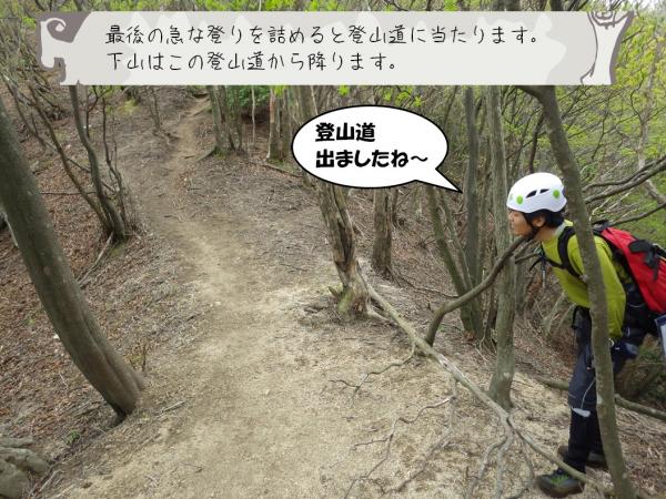 沢道から普通の下山道に出ると、道の崩壊が進んでいるため落石等の注意が必要です。
