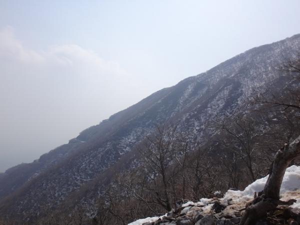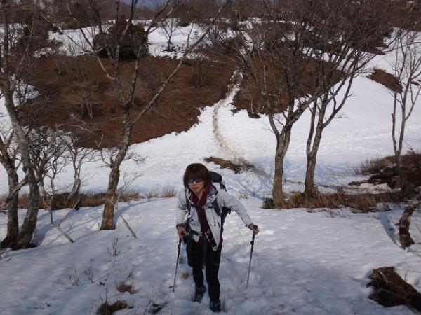 避難小屋から山頂へ向かうルートでは雪と土が泥のように混ざり合っていて滑りやすく注意が必要です。
