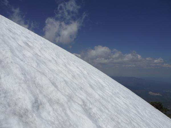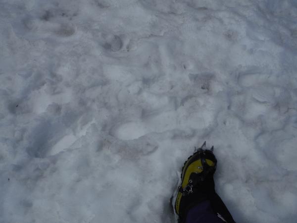 朝早くは雪は少ししまってアイゼン効きやすいですが、下山の午後は日光に解け出しシャーベット状で滑りやすいです。