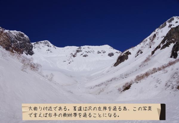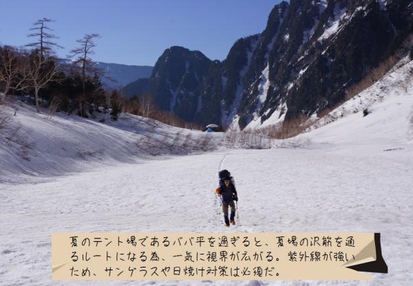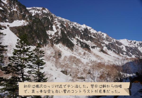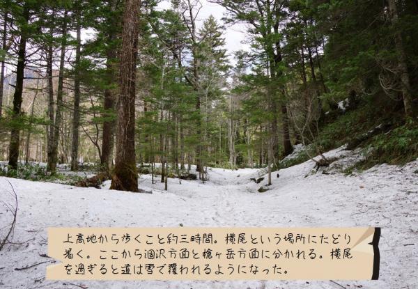 横尾以降は雪がまだかなりあります。一ノ股~二ノ股間で山側が一部崩れている個所があるので落石に注意が必要です。