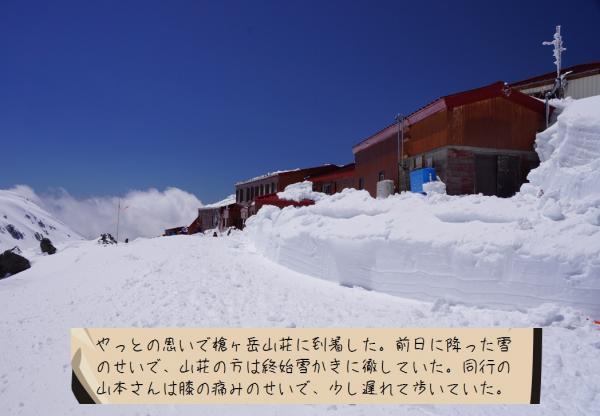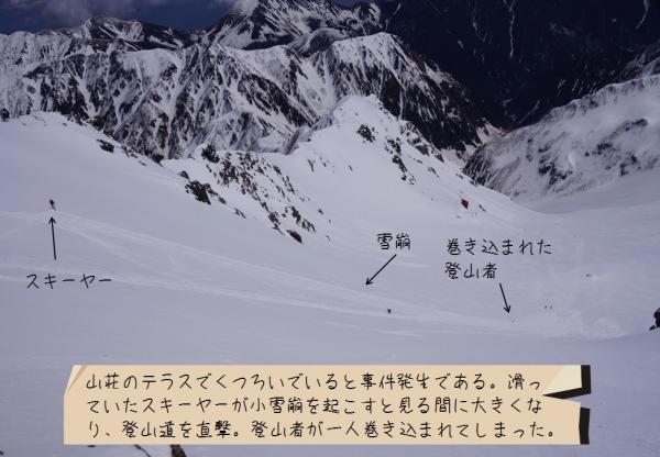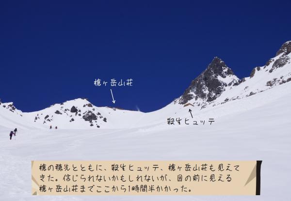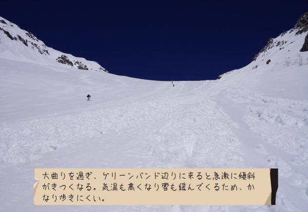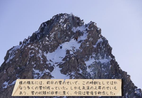 槍の穂先にはかなり雪が残っており、状態もかなり悪いため、ロープ、ハーネス等の準備があった方が安全です。