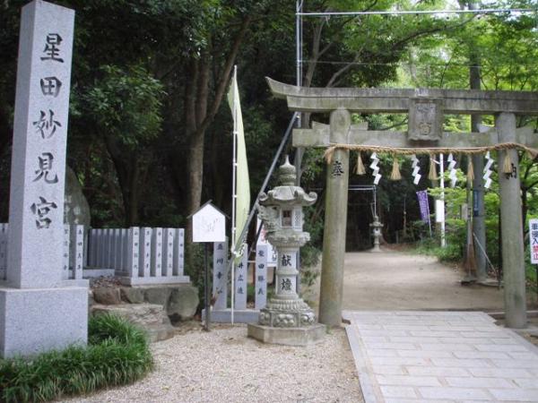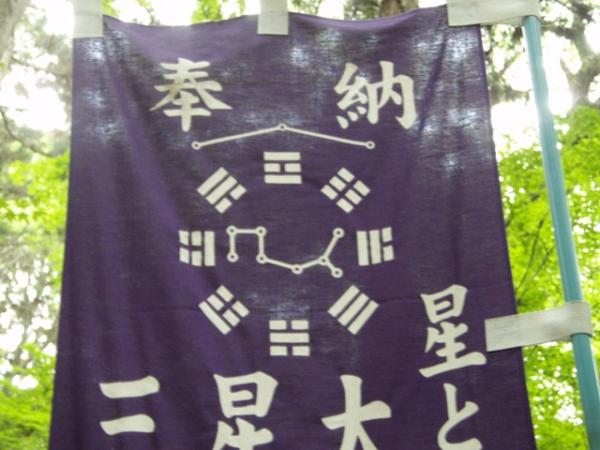 出発地点は星田妙見宮(小松神社)。ここは国内で2番目に古い隕石の落下記録の残る神社で、落下時の衝撃で山の大半が吹き飛んで馬蹄形に窪んだ形状になったそうです。とりあえず参道を歩いていくと、目に付くのが珍しい北斗七星(七曜星)の神紋。弘法大師・空海が修行中に北斗七星から隕石が降ってきた伝説に由来するとの事。